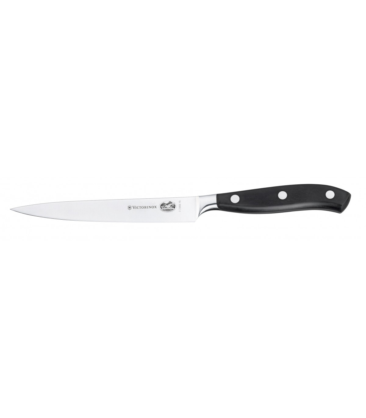Cette classification grand maître est compatible au grand cuisinier ou à la simple ménagère. Ce fastueux couteau à découper est forgé d'une seule pièce à Solingen en Allemagne. Son expressif manche d'une anatomie ergonomique est en manche en polyoxyméthylène noir. Son étincelante lame de 15 cm en acier inox forgée est d'une respectable robustesse. L'aciérage de sa lame Made by Victorinox est préservé, étant contrôlé d'un affûtage couplé et d'une expertise au laser. La présentation en boîte cadeaux met en relief cette réalisation.