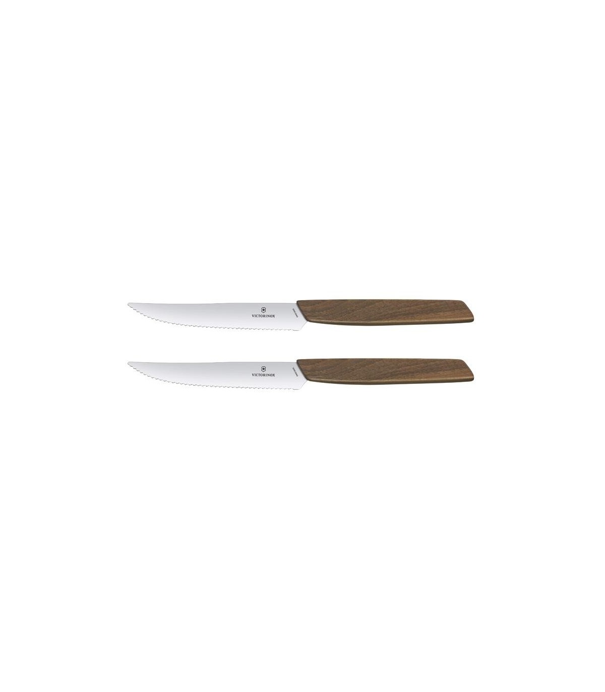 Victorinox 6.9000.12wg Set de 2 couteaux steak Swiss Modern, lame dentée 12 cm, manche noyer. Présentation en boîte cadeau.
