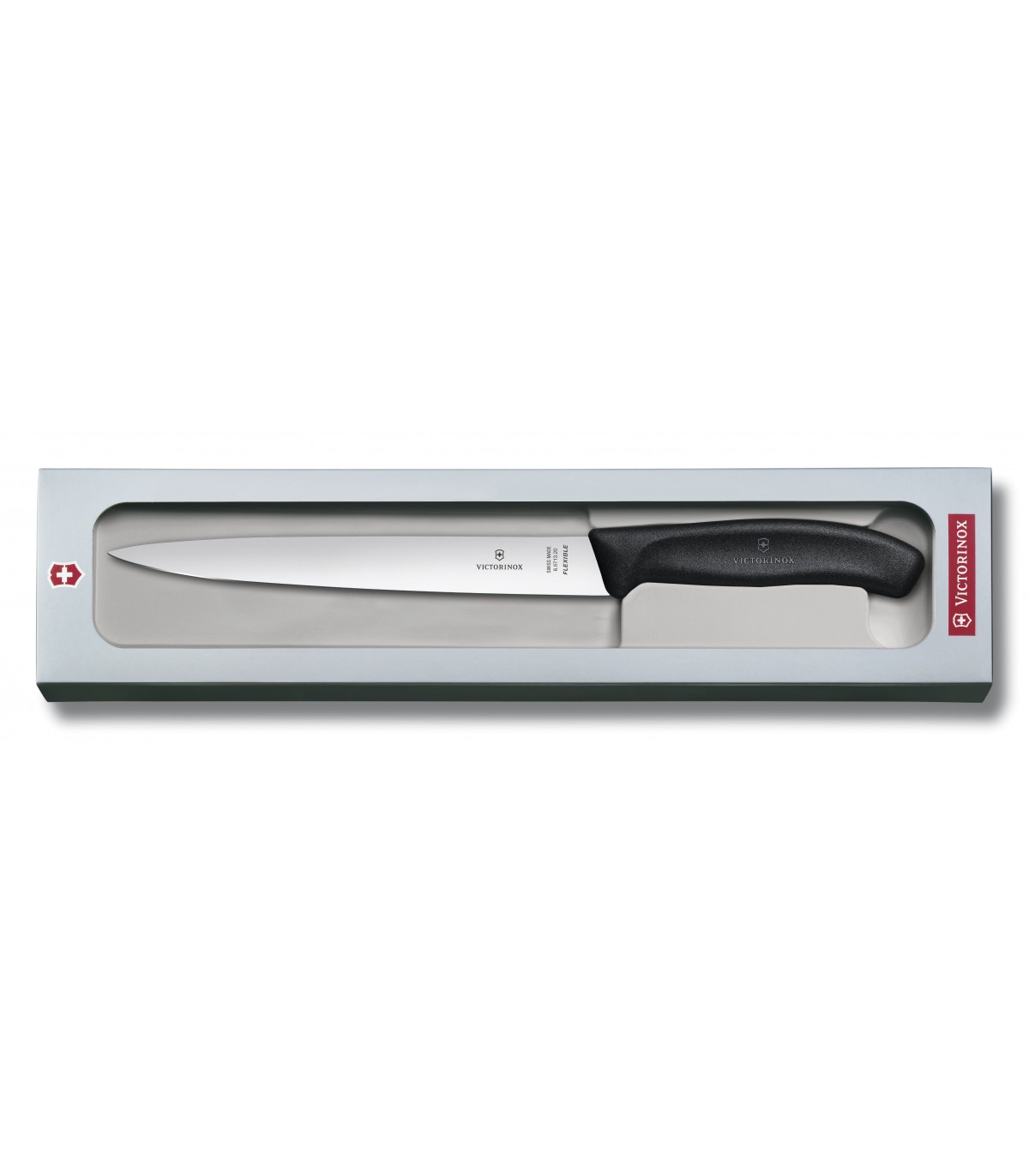 Victorinox 6.8713.20g Couteau Santoku Dénerver/A Filet de Sole, lame flexible 20 cm inox, manche polypropylène noir, sur carte.