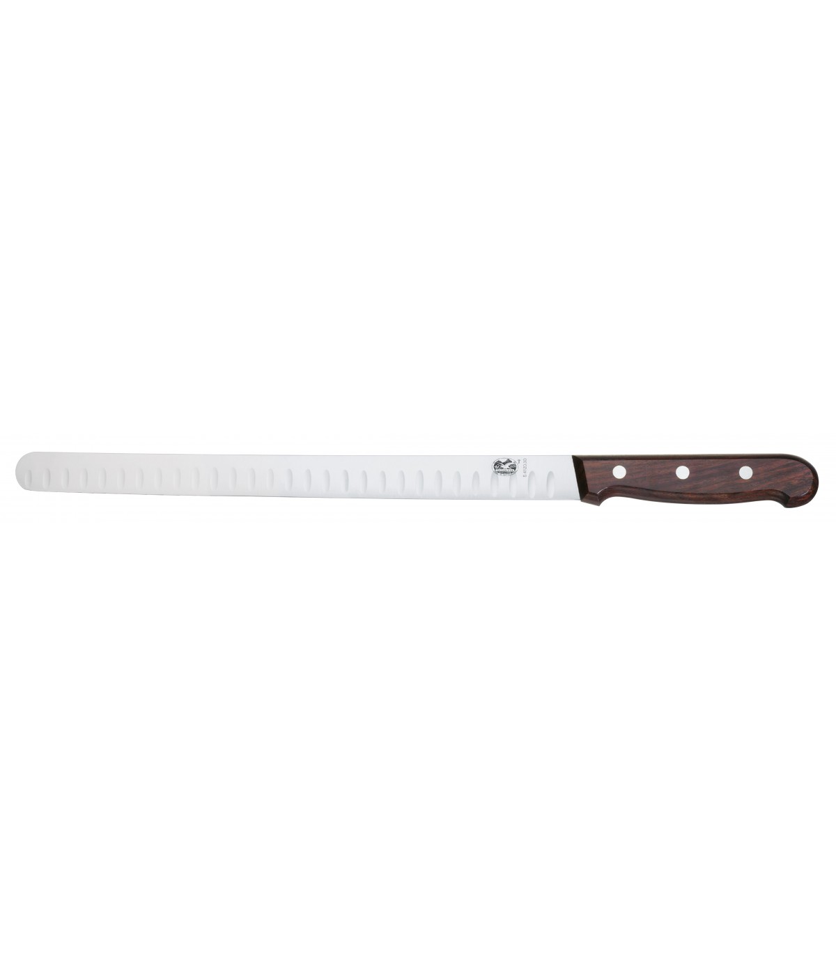 Victorinox s'exprime par cette création d'un couteau d'une grande finesse et d'une ligne élancée. Ce couteau jambon saumon vous séduira par sa maniabilité et sa souplesse. Un sublime manche en bois de palissandre riveté de 3 points vous charmera par son design. Une étonnante lame en acier inox alvéolée de 30 cm accompagne ce couteau.