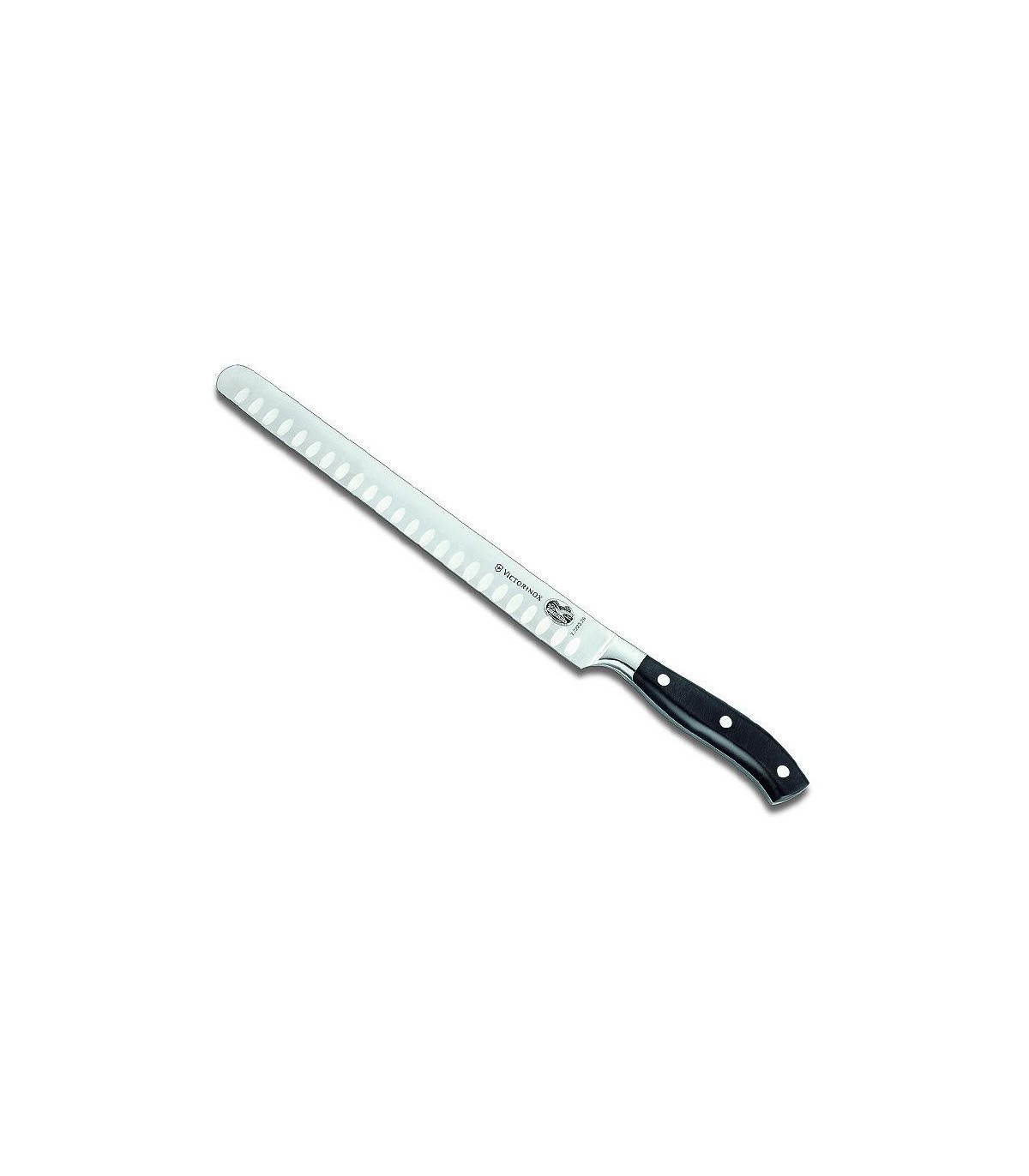 Ce sensationnel couteau jambon est forgé d'une seule et unique pièce à Solingen en Allemagne. tous les grands cuisiniers sauront s'équiper de ce couteau pour le tranchage du jambon, du saumon... Son plaisant manche d'une forme ergonomique est manche en polyoxyméthylène noir. Sa légendaire lame de 26 cm en acier alvéolée inox forgée est d'une étonnante fermeté. Le contondant de sa lame Made by Victorinox est favorisé, étant exposé par un double affûtage et d'un contrôle au laser. Sa boîte cadeau vous assure la protection de couteau.