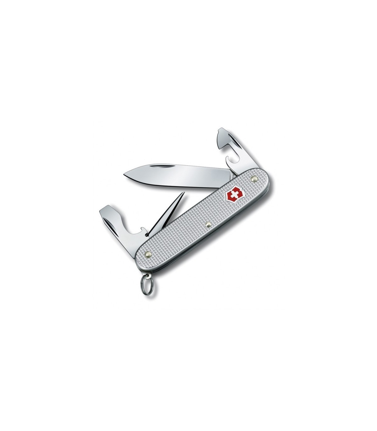 Cet épatant couteau Victorinox Pioneer vous enthousiasmera pour sa souplesse et son raffinement. Il bénéficie d 'un manche de 93 mm en alu quadrillé teinte argent. Il se décline 4 en pièces dont 8 fonctions patentes : une grande lame un poinçon alésoir un ouvre-boîtes avec - un petit tournevis 3 mm un décapsuleur avec - tournevis 6 mm un dénude fil électrique + un anneau