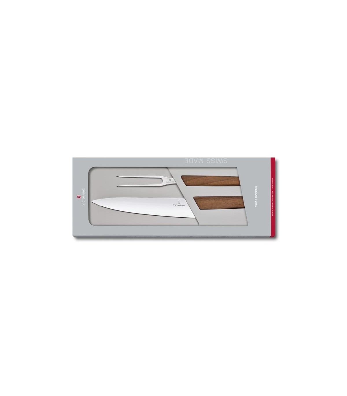 Coffret à découper Victorinox 2 pièces Swiss Modern, manche noyer, comprenant : <li>- 1 Fourchette découper, lame 15 cm inox (réf. 6.9030.15G). </li><li>- 1 couteau chef, lame 22 cm inox (réf. 6.9010.22G). </li><li>En boîte cadeau. </li>