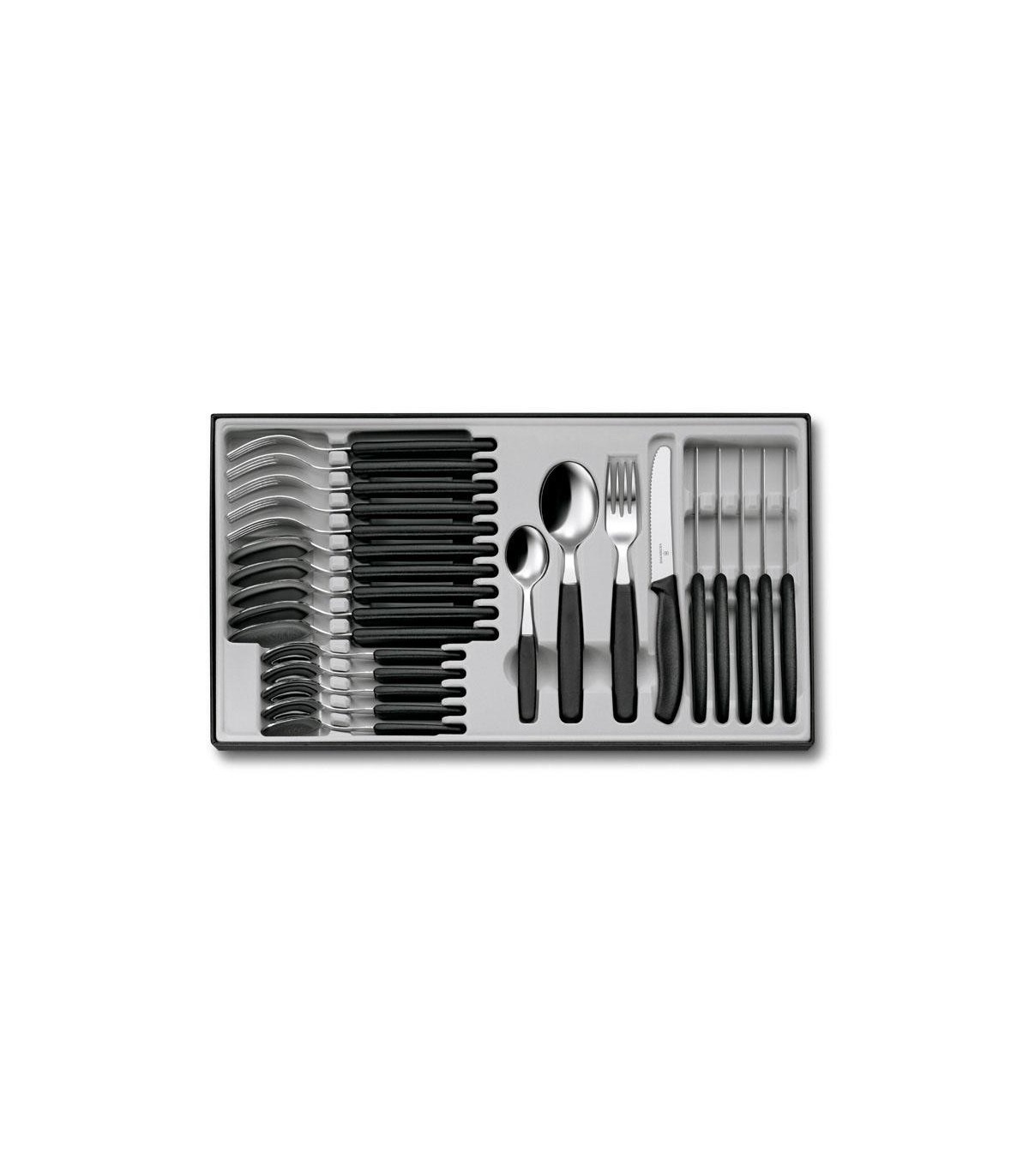Ménagère 24 pièces Swissclassic en acier inox 18/10, manche polypropylène noir, comprenant : - 6 couteaux table/tomates lame crantée 11 cm bout rond (Réf. 6.7833) - 6 fourchettes (Réf. 5.1543) - 6 cuillers à soupe (Réf. 5.1553) - 6 cuillers à café (Réf. 5.1573) Garantis lave-vaisselle.