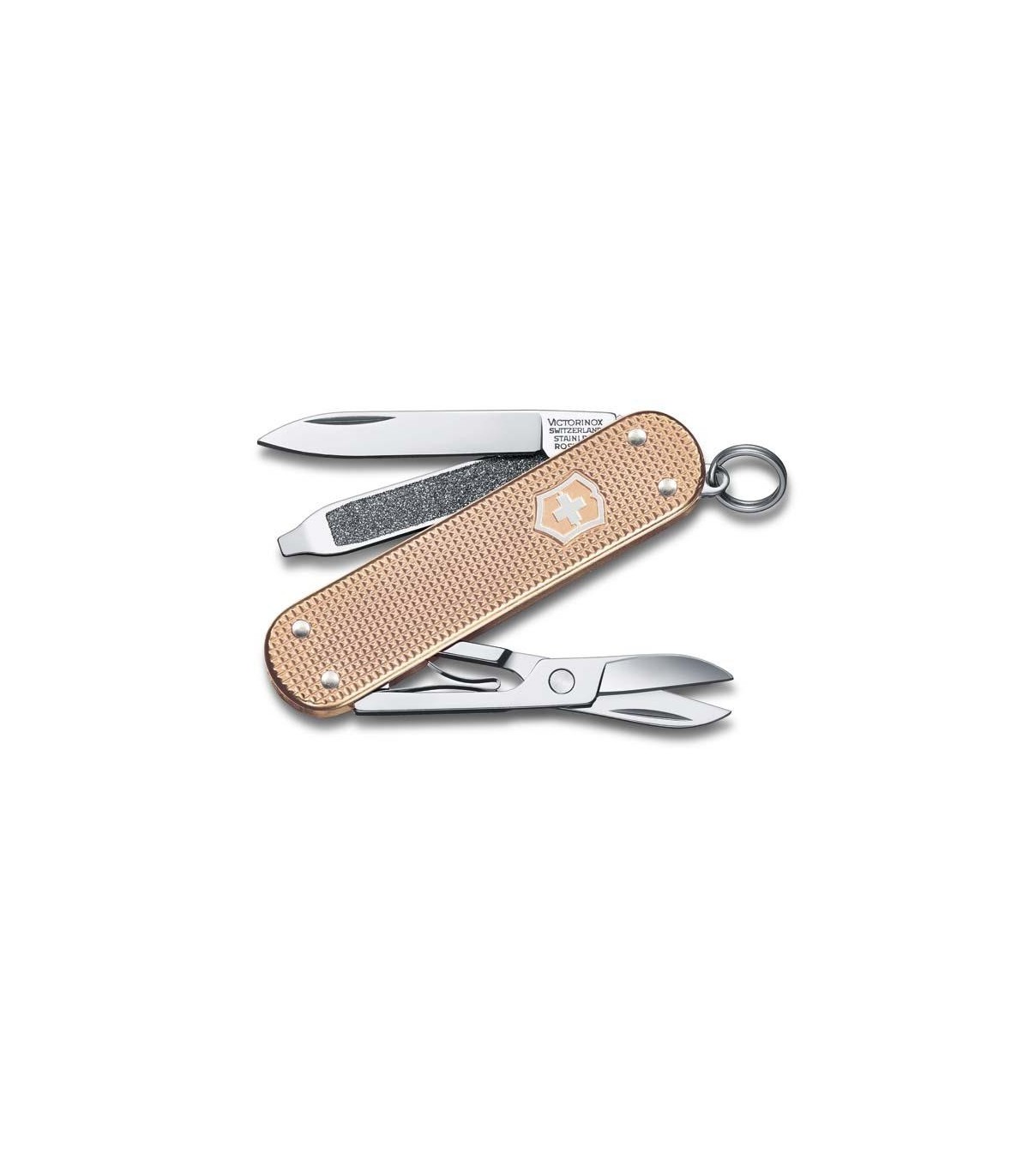 canif victorinox classic alox Fresh PeachManche 58 mm, rose pêche. 5 fonctions (3 pièces). 1. lame 2. lime à ongles avec: 3, tournevis 3 mm 4. ciseaux 5. anneaux