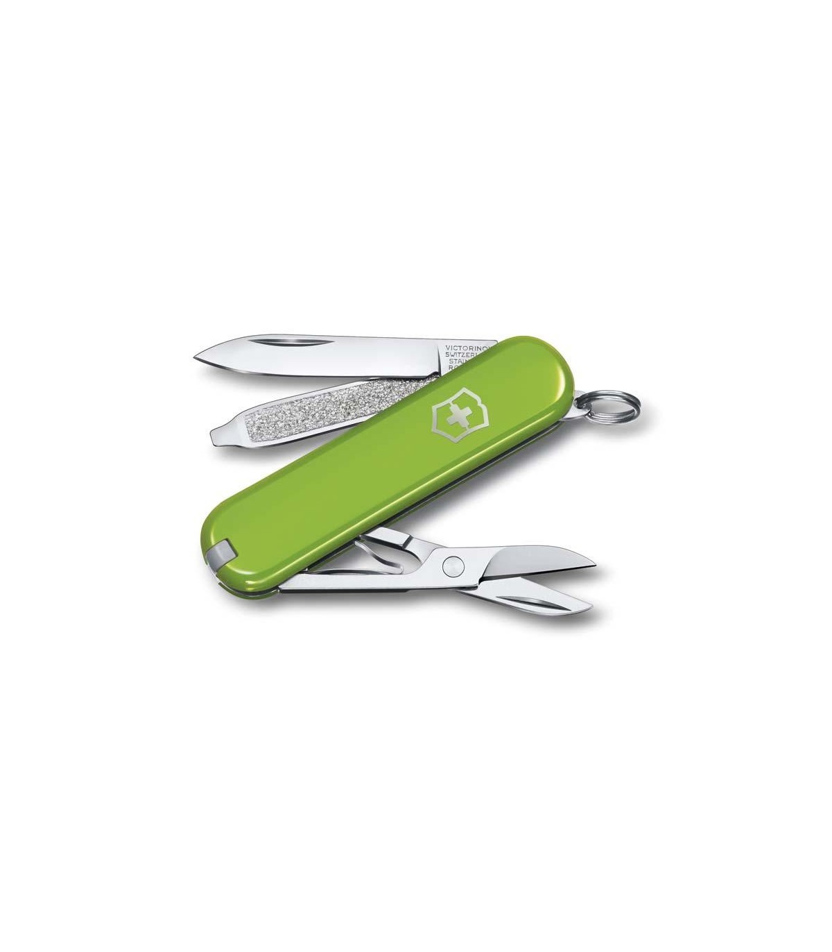 canif victorinox classic alox Smashed Avocado Manche 58 mm, bleu guacamole. 7 fonctions (5 pièces). 1. lame 2. lime à ongles avec: 3, tournevis 3 mm 4. ciseaux 5. pincette 6. cure-dents 7. anneau