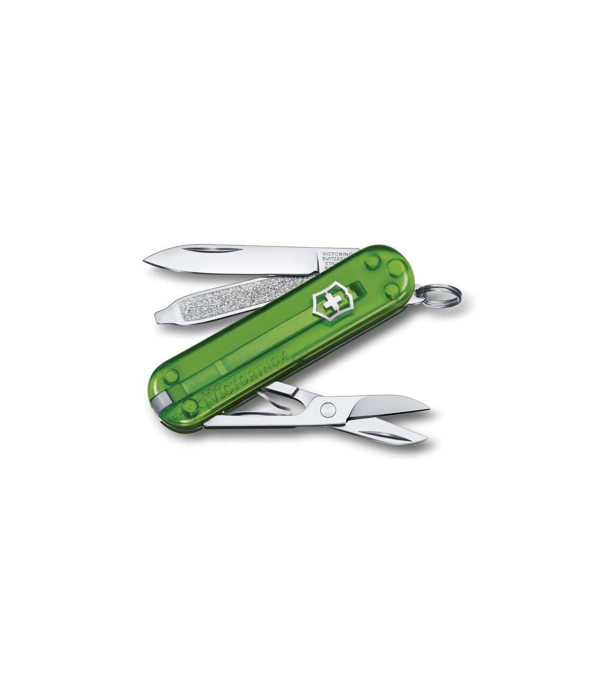 canif victorinox classic alox Green Tea Manche 58 mm, vert translucide. 7 fonctions (5 pièces). 1. lame 2. lime à ongles avec: 3, tournevis 3 mm 4. ciseaux 5. pincette 6. cure-dents 7. anneau