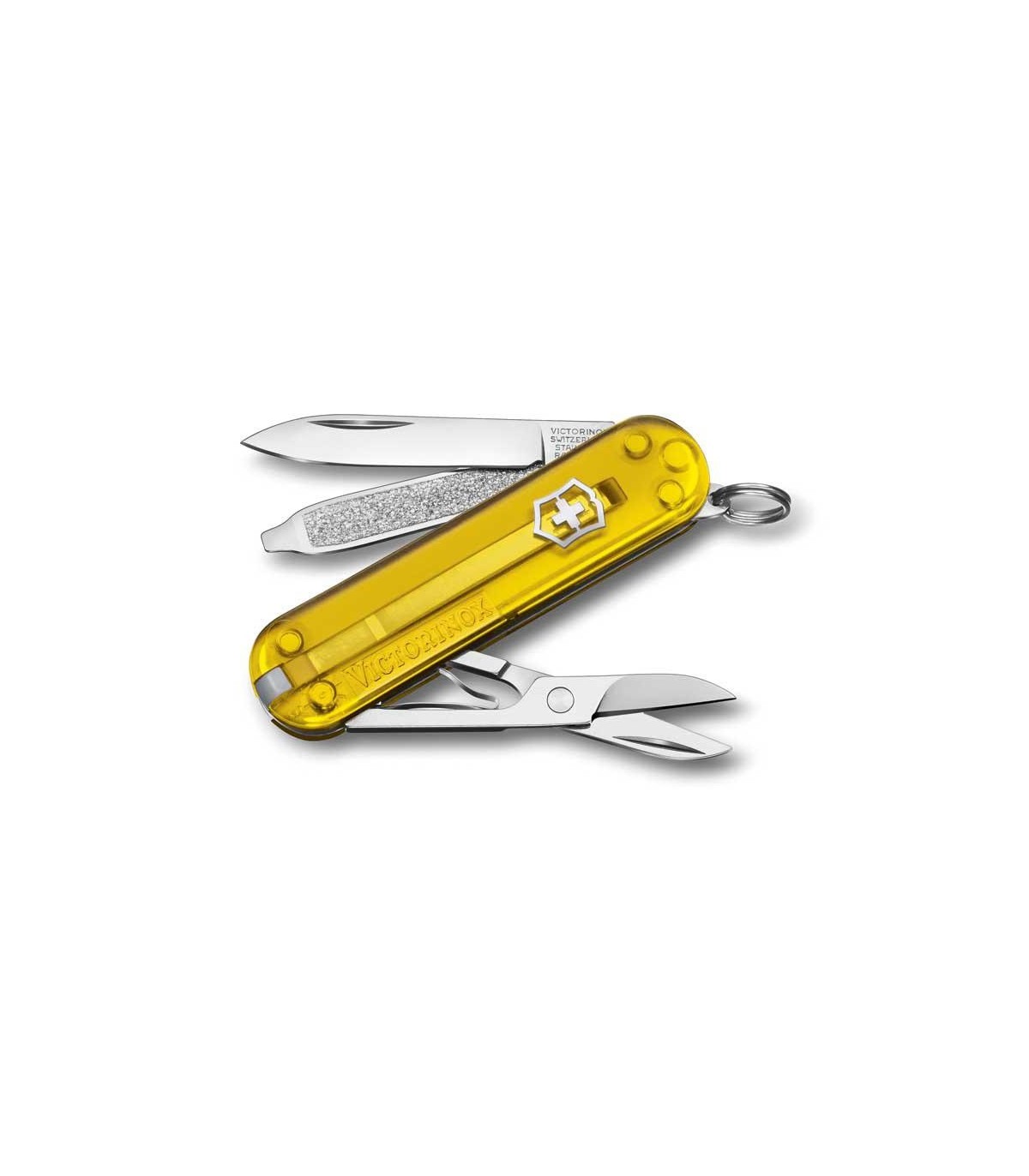 canif victorinox classic alox Tuscan Sun Manche 58 mm, jaune translucide. 7 fonctions (5 pièces). 1. lame 2. lime à ongles avec: 3, tournevis 3 mm 4. ciseaux 5. pincette 6. cure-dents 7. anneau