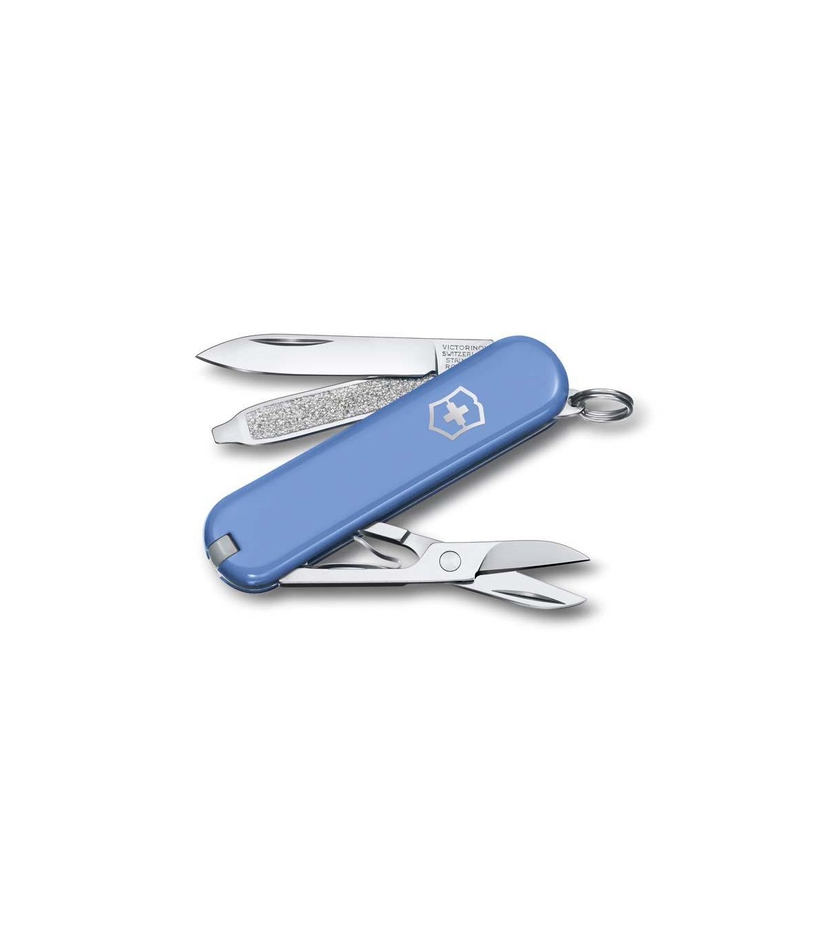 canif victorinox classic alox Summer RainManche 58 mm, bleu ciel. 7 fonctions (5 pièces). 1. lame 2. lime à ongles avec: 3, tournevis 3 mm 4. ciseaux 5. pincette 6. cure-dents 7. anneau