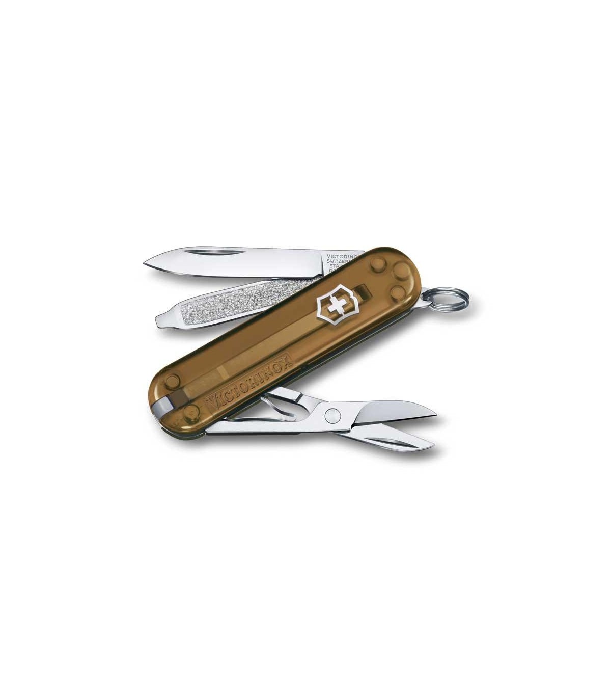 canif victorinox classic alox Chocolate Fudge Manche 58 mm, citron vert. 7 fonctions (5 pièces). 1. lame 2. lime à ongles avec: 3, tournevis 3 mm 4. ciseaux 5. pincette 6. cure-dents 7. anneau