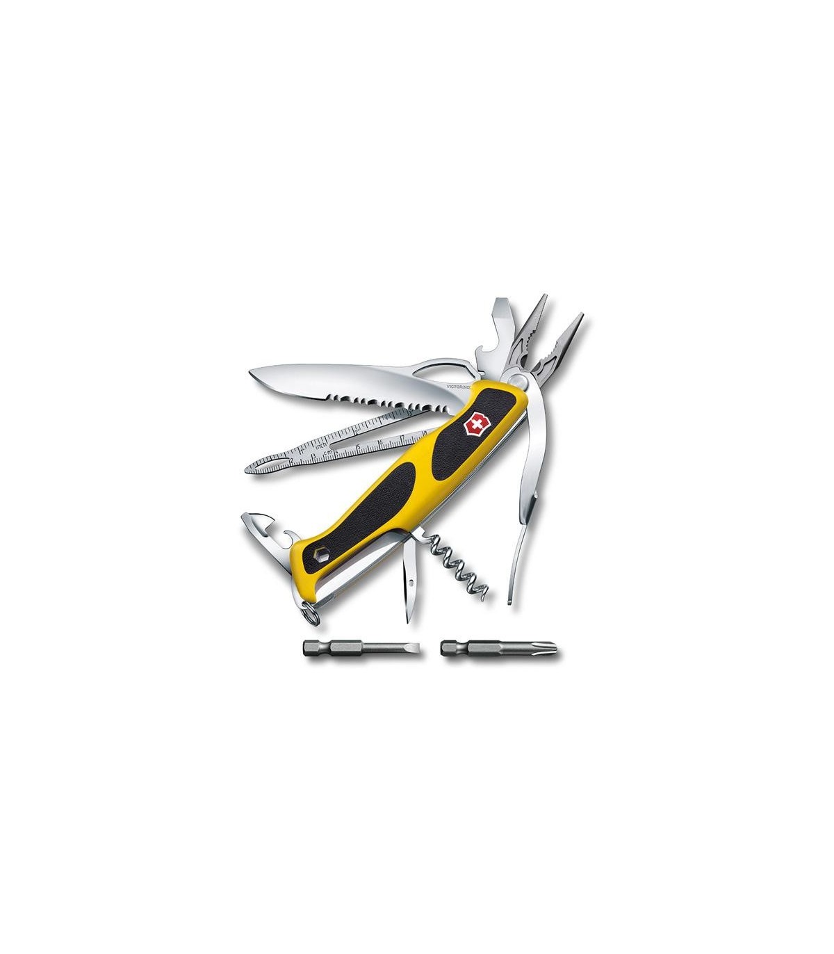 Ce somptueux couteau delémont Rangergrip Bostman réalisé avec beaucoup de pragmatisme par la manufacture Suissesse Victorinox deviendra par ses nombreuses fonctions un Outil indispensable pour vous. Victorinox est lexcellence de la coutellerie pour sa fiabilité et la qualité de ses conceptions. Ce couteau dune lame de 130 mm sassocie à un somptueux manche en grip de teinte jaune et noire. Il se fragmente en 21 fonctions répertoriées parmi les 11 pièces polyvalentes : lame blocable ouverture une main tranchant denté 2/3 - un cure-ongles des ciseaux à micro-dents un ouvre-boîtes avec - un tournevis 3 mm un décapsuleur avec -un tournevis, blocable - une encoche fils électrique un porte embouts avec - démanilleur - mesure (cm+ pouces) - épingle- une Pince à bec fin - un coupe-fil - un serre-écrou - une épingle un tire-bouchon un poinçon alésoir boîtier avec - embout phillips 3 - embout plat 0.6 x4.5 mm des Pincettes un anneau, inox . t denté 2/3 - un cure-ongles des ciseaux à micro-dents un ouvre-boîtes avec - un tournevis 3 mm un décapsuleur avec -un tournevis, blocable - une encoche fils électrique un porte embouts avec - démanilleur - mesure (cm+ pouces) - épingle- une Pince à bec fin - un coupe-fil - un serre-écrou - une épingle un tire-bouchon un poinçon alésoir boîtier avec - embout phillips 3 - embout plat 0.6 x4.5 mm des Pincettes un anneau, inox .