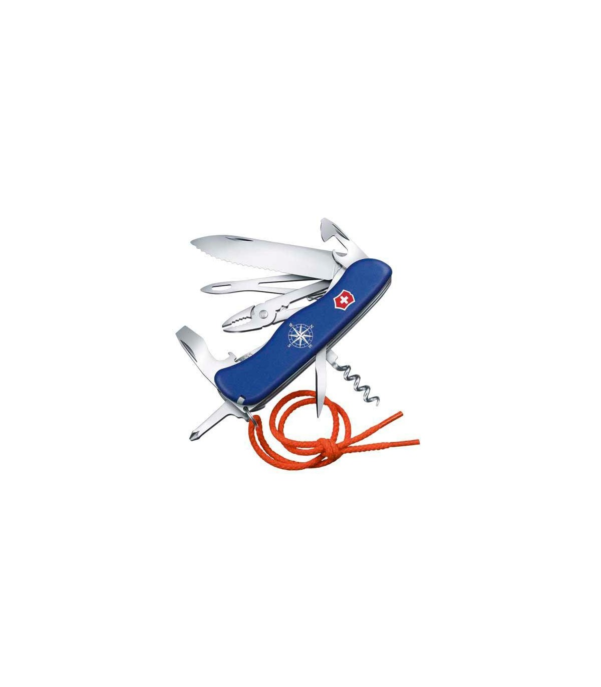Victorinox skipper bleu motif « rose des vents » manche 111 mm, bleu mat. 18 fonctions (10 pièces). 1. grande lame a cran intérieur, tranchant 3/4 dente 2. décapsuleur a cran intérieur avec : 3. - tournevis 8 mm 4. - dénude fil électrique 5. tire-bouchon 6. ouvre-boites avec : 7.- petit tournevis 3 mm 8. poinçon alésoir 9. épissoir avec : 10. démanilleur 11. Pince multi-usages avec : 12. - serre-cosse 13. coupe fils 14. tournevis cruciforme court 15. Pincette 16. cure-dents 17. anneau 18. cordon orange.