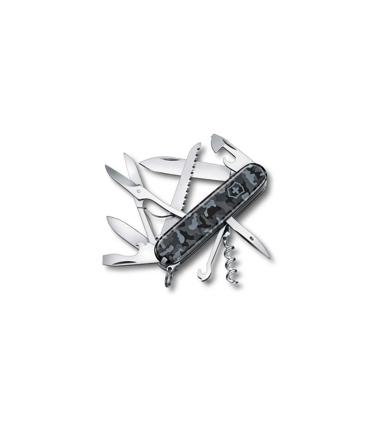 HUNTSMAN Vctorinox. Manche 91 mm, camouflé Navy. 16 FONCTIONS (11 PIECES). 1. grande lame 2. petite lame 3. tire-bouchon 4. ouvre-boîtes avec : 5. - petit tournevis 3 mm 6. décapsuleur avec : 7. - tournevis 6 mm 8. - dénude fil électrique 9. poinçon alésoir avec 10. - chas d'aiguille 11. crochet multi-usages 12. Ciseaux 13. scie à bois 14. Pincettes 15. cure-dents 16. Anneau.