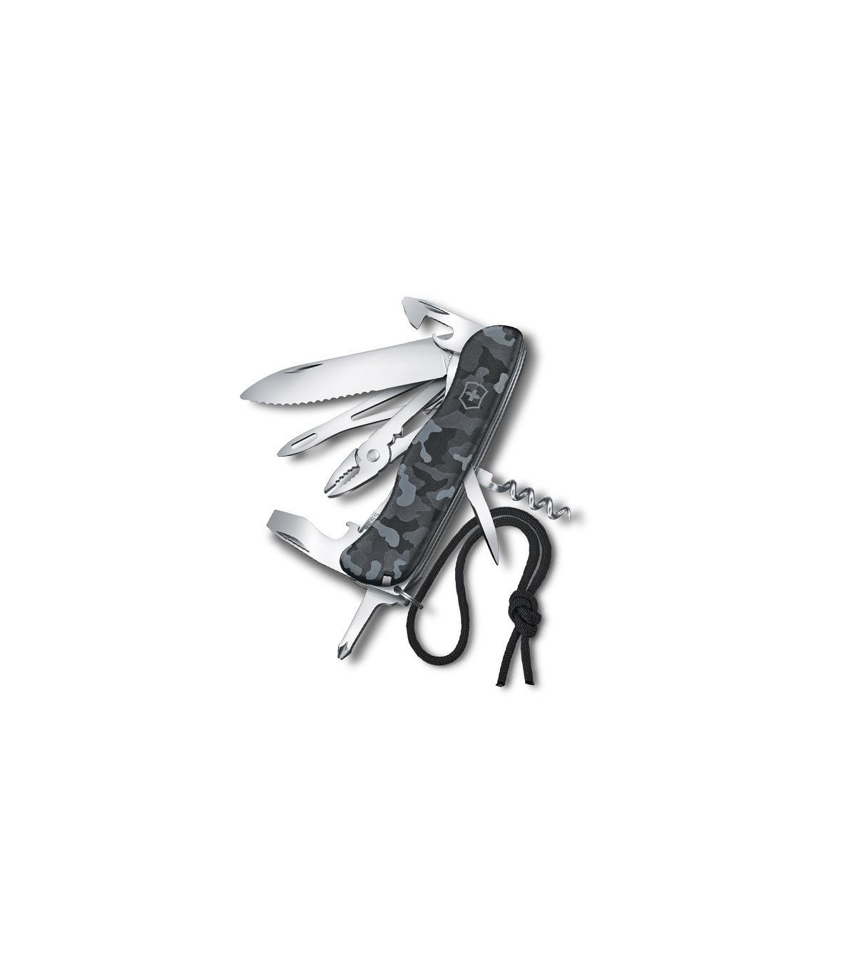 Couteau Victorinox skipper camoufle navymanche 111 mm, camoufle navy. 18 fonctions (10 pieces). 1. grande lame a cran interieur, tranchant 3/4 dente 2. decapsuleur a cran interieur avec : 3. - tournevis 8 mm 4. - denude fil electrique 5. tire-bouchon 6. ouvre-boites avec : 7.- petit tournevis 3 mm 8. poinçon alesoir 9. epissoir avec : 10. - demanilleur 11. pince multi-usages avec : 12. - serre-cosse 13. - coupe-fil 14. tournevis cruciforme court 15. pincettes 16. cure-dents 17. anneau 18. cordon noir