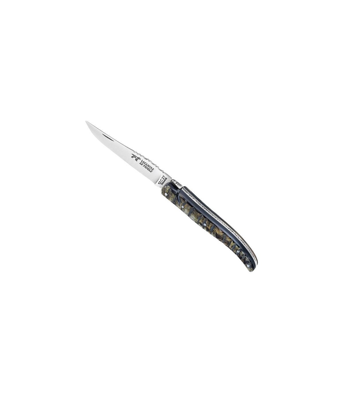 Ce couteau laguiole le fidèle a été forgé traditionnellement avec une grande application et beaucoup de délicatesse dans ses ateliers artisanaux. Son somptueux décor avec son manche de 12 cm en corne de bélier pourra éventuellement égayer votre table. Sa chatoyante lame en acier 12 c 27 est fusionné avec un superbe ressort guilloché manuellement. Le greffage de l'abeille atteste son authenticité.