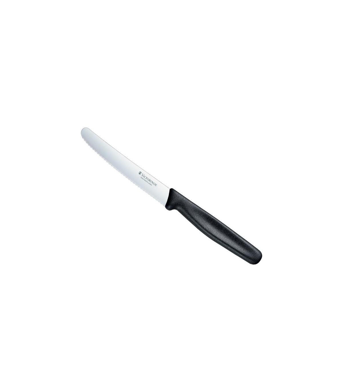 Cette boîte de 20 couteaux de table ou tomates crantée à bout ronda été élaborée dans les ateliers de Victorinox. Ce couteau peut soit ornée votre salle à manger, doit être utilisé en cuisine pour la découpe de tomates et autres légumes. Il se caractérise par un manche en fibrox de nombreuses couleurs : noir, rouge ou bleu. Sa sublime lame de 11 cm en acier inoxydable est crantée et à bout en rond.