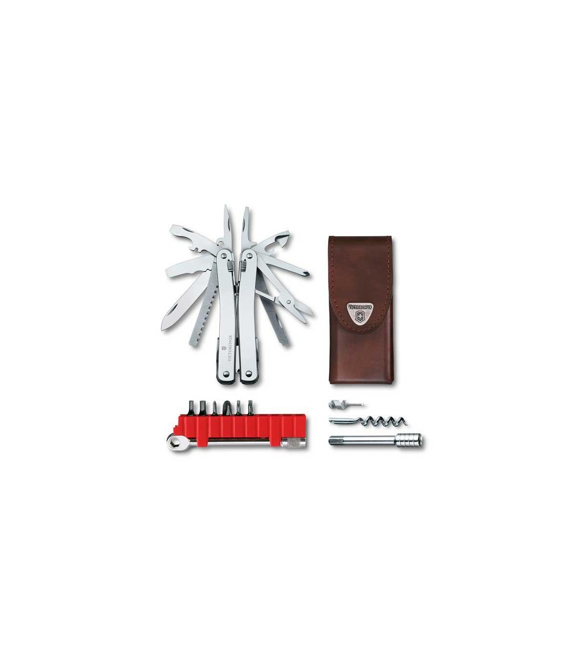 swisstool spir. x plus ratche + étui cuir La matérialisation de cette superbe Pince Swisstool X plus ratchet a été réalisé avec le concours des artisans de la manufacture Suissesse de Victorinox. Cette efficace pince est constitué de 37 fonctions (21 pièces) une pince pointue avec - coupe fil pour fil fin de dureté maxi de 40 HRC et d'un coupe-fil fort et dur un décapsuleur avec : un tournevis 6 mm, un outil levier et un plieur de fil électrique un tournevis 2 mm lame pointue ciseaux lime à métaux avec : scie à metaux scie à bois poiçon alésoir avec : crochet multi-fonctions tournevis cruciforme 1+2 racloir / ciseau à bois avec : coupe gaine dans la longueur, dénudeur / racloir fil électrique et coupe gaine circulaire ouvre-boîte avec : tournevis 3 mm encoche pour tire-bouchon point d'attache étui cuir ou nylon boitier avec : clé à cliquet -30Nm), embout Hex 3, Hex 4, Phillips 0, phillips 3, Torx 10, Tors 15 et emplacement embouts supplèmentaires mini-tournevis 1,5 mm tire-bouchon prolongateur d'outil