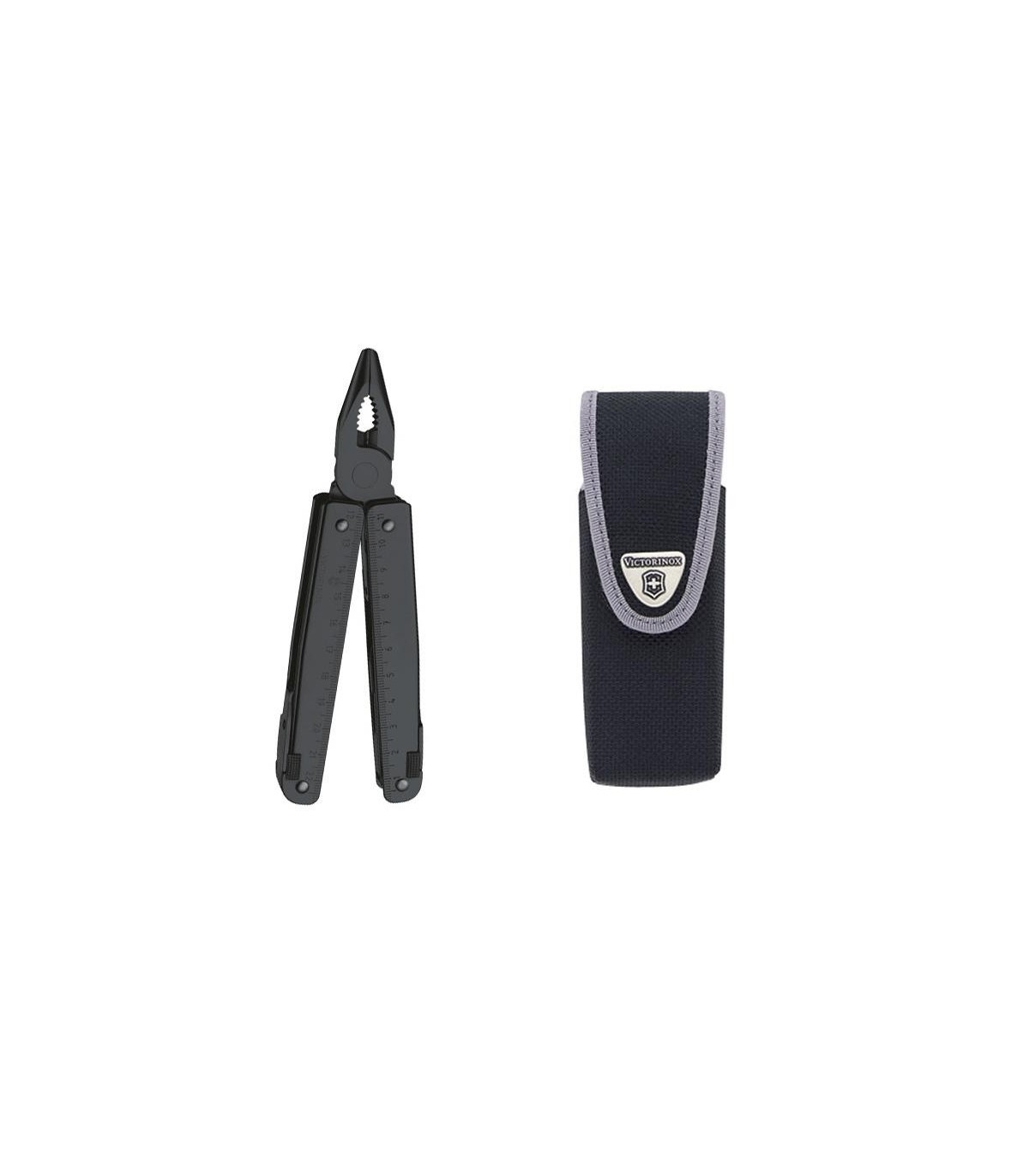 La technique de la Société Victorinox a légitimé la conception de cet Outil avec une parfaite cohérence et un savoir reconnu dans le monde entier. Cet Outil se scinde de 12 pièces comportant 30 fonctions. une Pince multiusages un coupe-fil pour fil fin de dureté maxi de 40 HRC un coupe fil dur un ouvre-boîtes avec tournevis 3 mm un plieur de fil électrique un tournevis 5 mm un décapsuleur un serre cosse un tournevis 7.5 mm une scie à métaux une scie à bois un petit tournevis 2 mm une lame pointue un ciseau à bois un tournevis cruciforme 1+2 une lame tranchante ondulé une Pince multiusage un étui cuir, nylon et nylon plus une règle en mm (230) une règle en pouces (9) une équerre une lime à métaux un poinçon alésoir un racloir fil électrique un dénudeur fil électrique un tournevis 3 mm un point dattache onze ressorts individuels un poussoir pour déblocage un traitement de surface Ebonol, noir anti-reflets une encoche pour tire-bouchonLes multiples éléments peuvent être ouVerts directement, sans qu'il soit nécessaire, tout d'abord, d'ouvrir la Pince. Un mécanisme breveté par la célèbre marque Victorinox fait que les pièces sont bloquées une fois ouVertes. Ce majestueux Outil dun poids de 286 grammes et dune longueur de 115 mm complète allégrement votre Outillage.