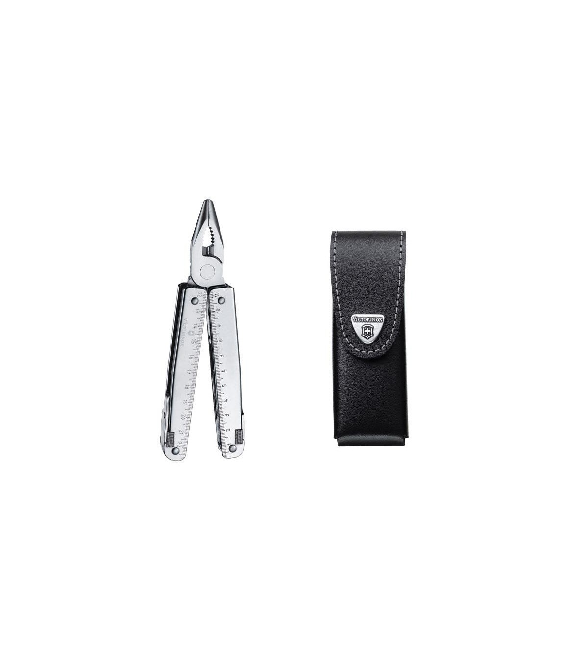 Lingéniosité des artisans de la Société Victorinox a contribué par leurs habiletés professionnelles à lélaboration de cet Outil Swisstool. Cet Outil se segmente de 12 pièces englobant 30 attributions. une Pince multiusages un coupe-fil pour fil fin de dureté maxi de 40 HRC un coupe fil dur un ouvre-boîtes avec tournevis 3 mm un plieur de fil électrique un tournevis 5 mm un décapsuleur un serre cosse un tournevis 7.5 mm une scie à métaux une scie à bois un petit tournevis 2 mm une lame pointue un ciseau à bois un tournevis cruciforme 1+2 un ciseau une Pince multiusage un étui cuir, nylon ou cuir pivotant une règle en mm (230) une règle en pouces (9) une équerre une lime à métaux un poinçon alésoir un racloir fil électrique un dénudeur fil électrique un tournevis 3 mm un point dattache onze ressorts individuels un poussoir pour déblocage une encoche pour tire-bouchonLes multiples éléments peuvent être ouVerts directement, sans qu'il soit nécessaire, tout d'abord, d'ouvrir la Pince. Un mécanisme breveté par la célèbre marque Victorinox fait que les pièces sont bloquées une fois ouVertes. Cet extraordinaire Outil dun poids de 286 grammes et dune longueur de 115 mm sera le complément idéal de votre caisse à Outils.