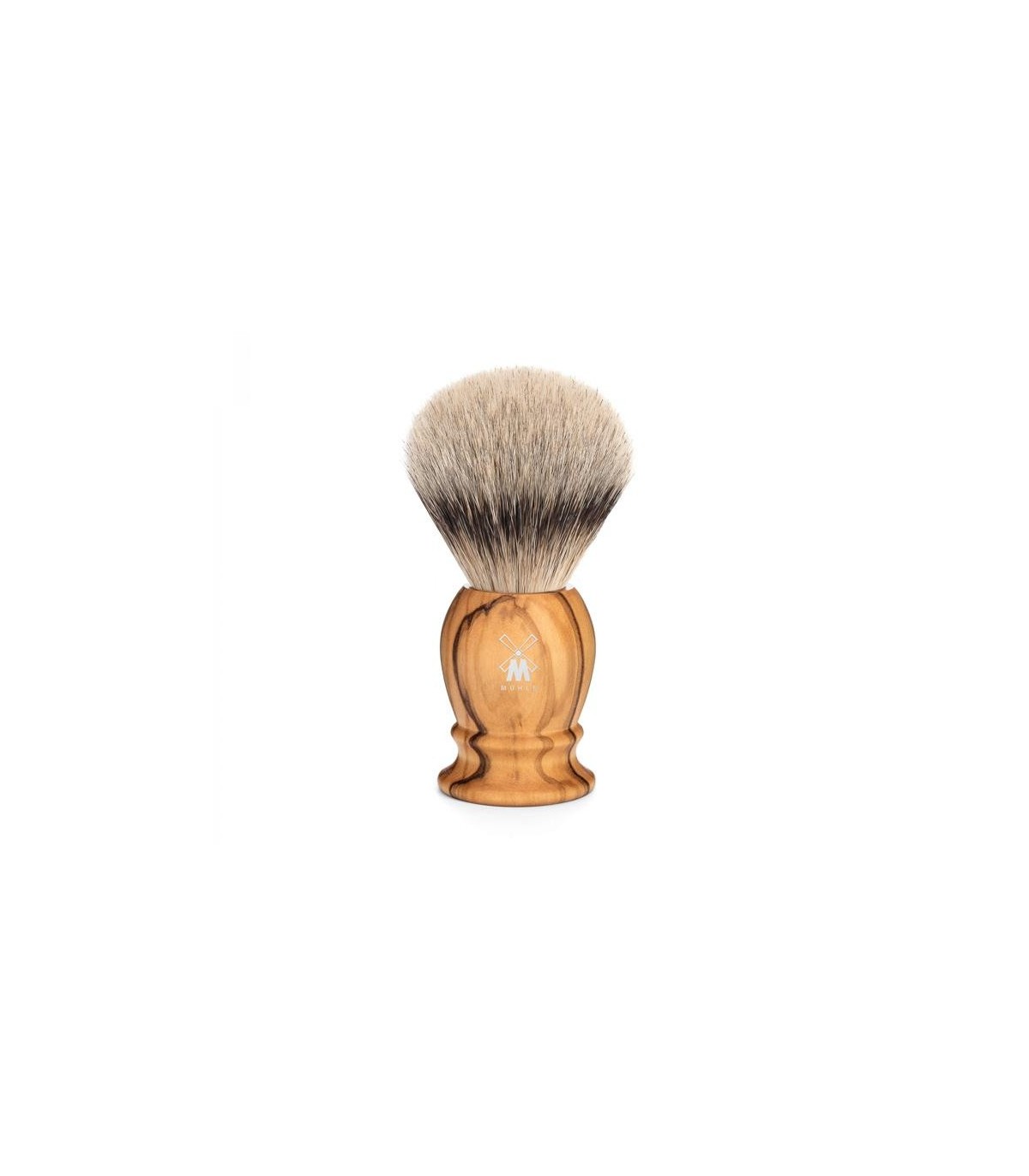 Blaireau MUHLE « CLASSIC », pur argenté (silvertip badger) Ø 19 mm, monture en bois d'olivier.