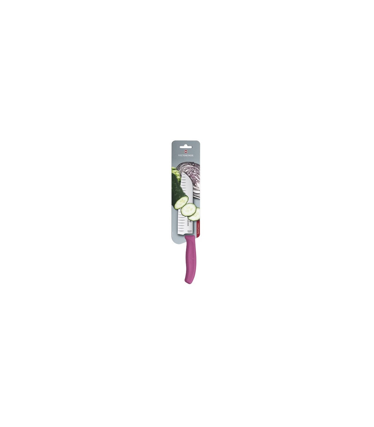 Victorinox 6.8526.17l5b Couteau Santoku, lame alvéolée 17 cm inox, manche polypropylène rose, sur carte.